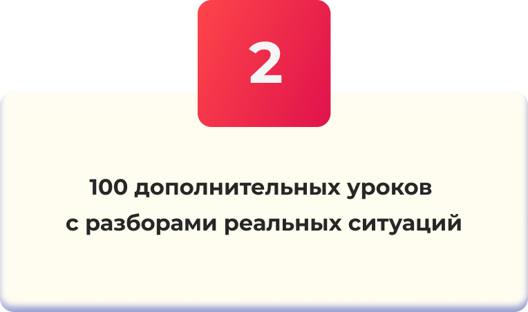 У тебя будет доступ в личный кабинет на нашей образовательной платформе, где уже собраны записи 20-ти уроков с заданиями и 100 уроков с разбором различных ситуаций. Продолжительность уроков от 1.5 до 3 часов